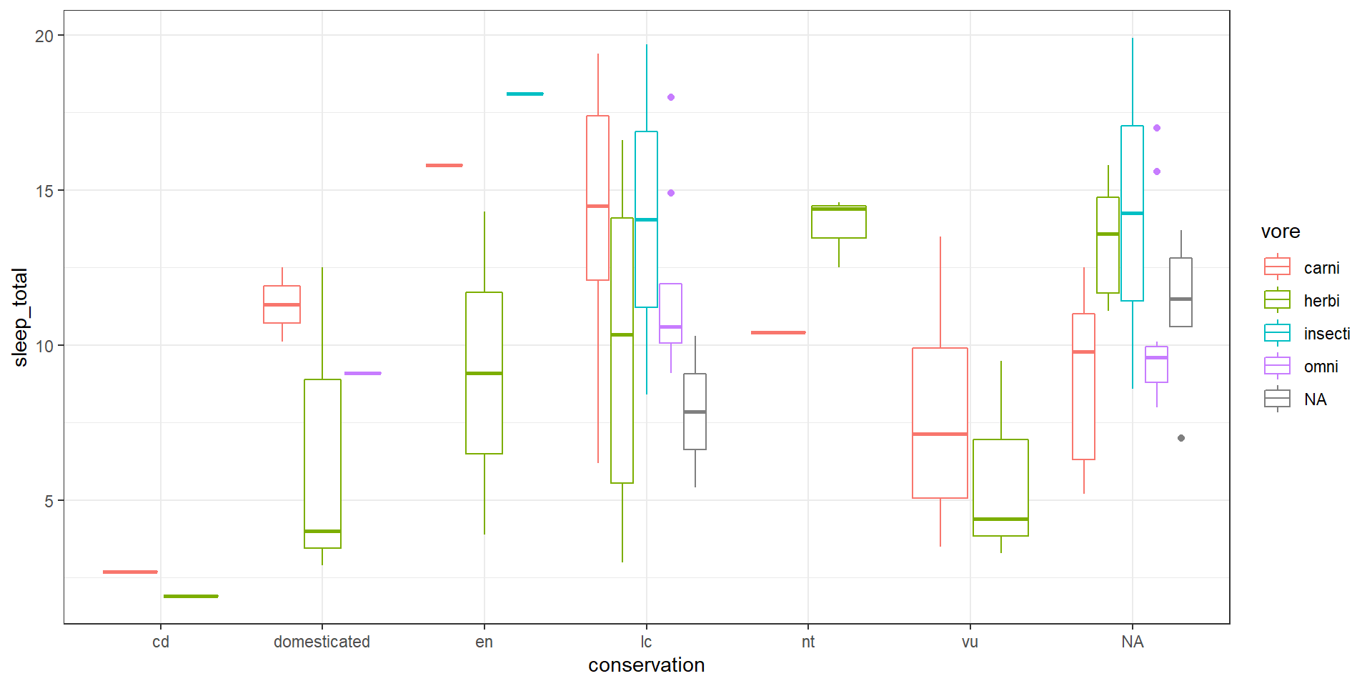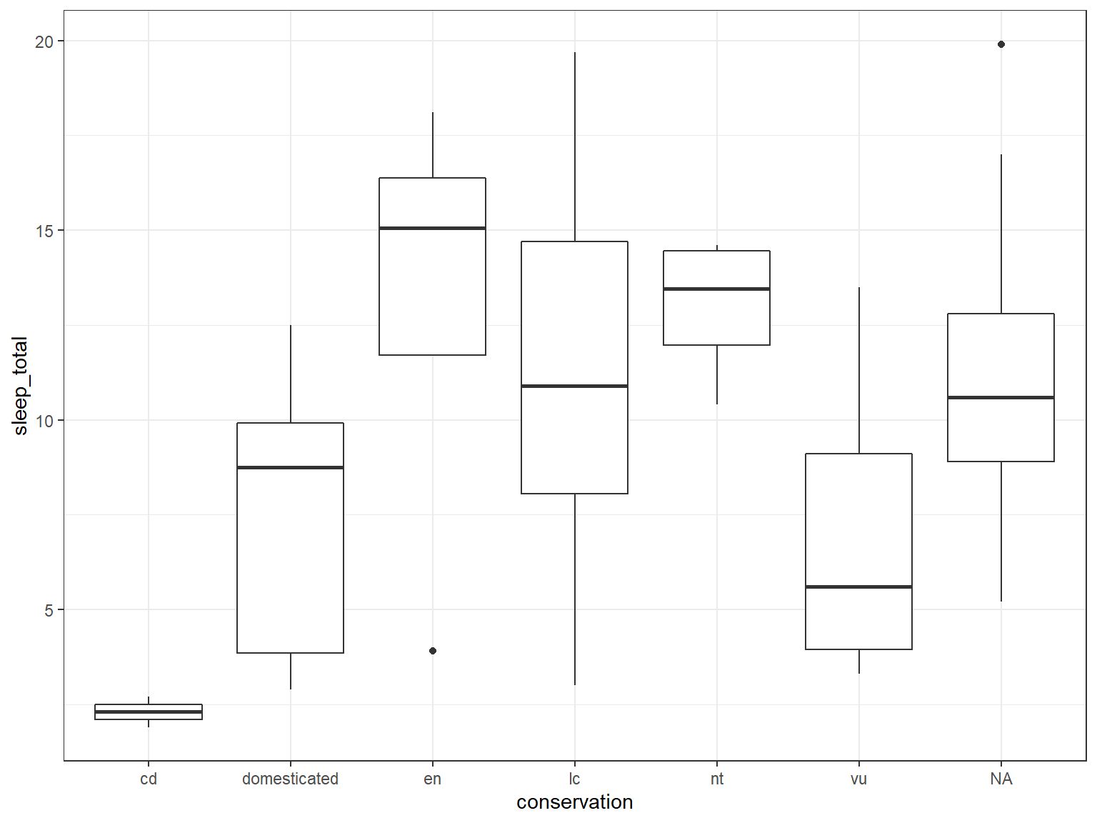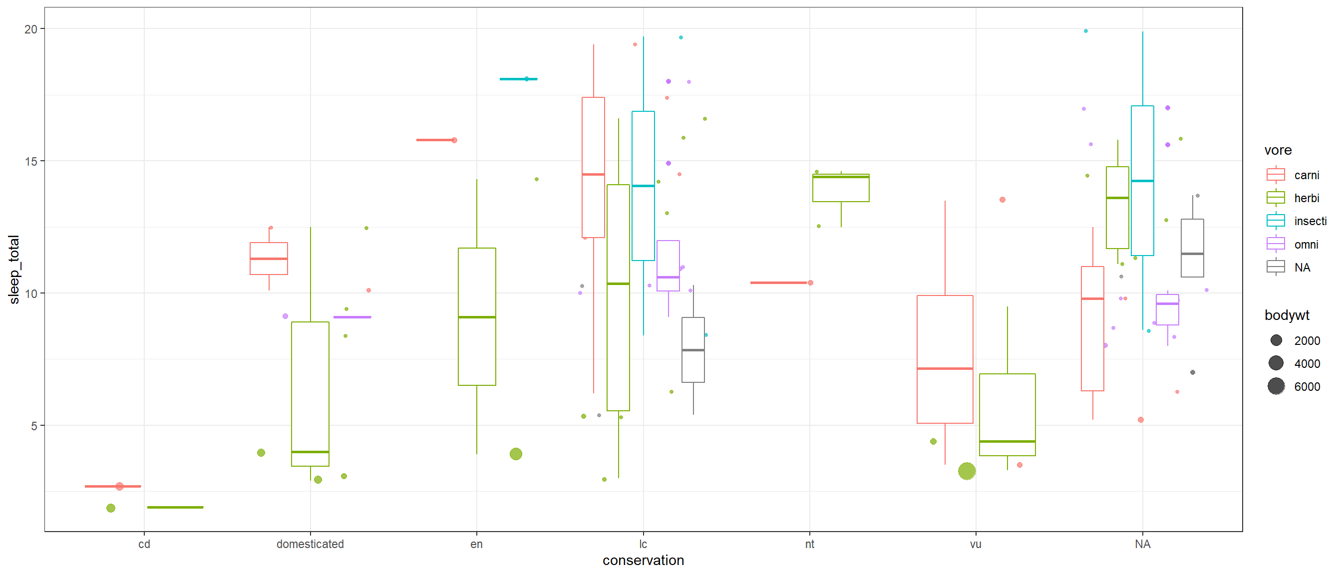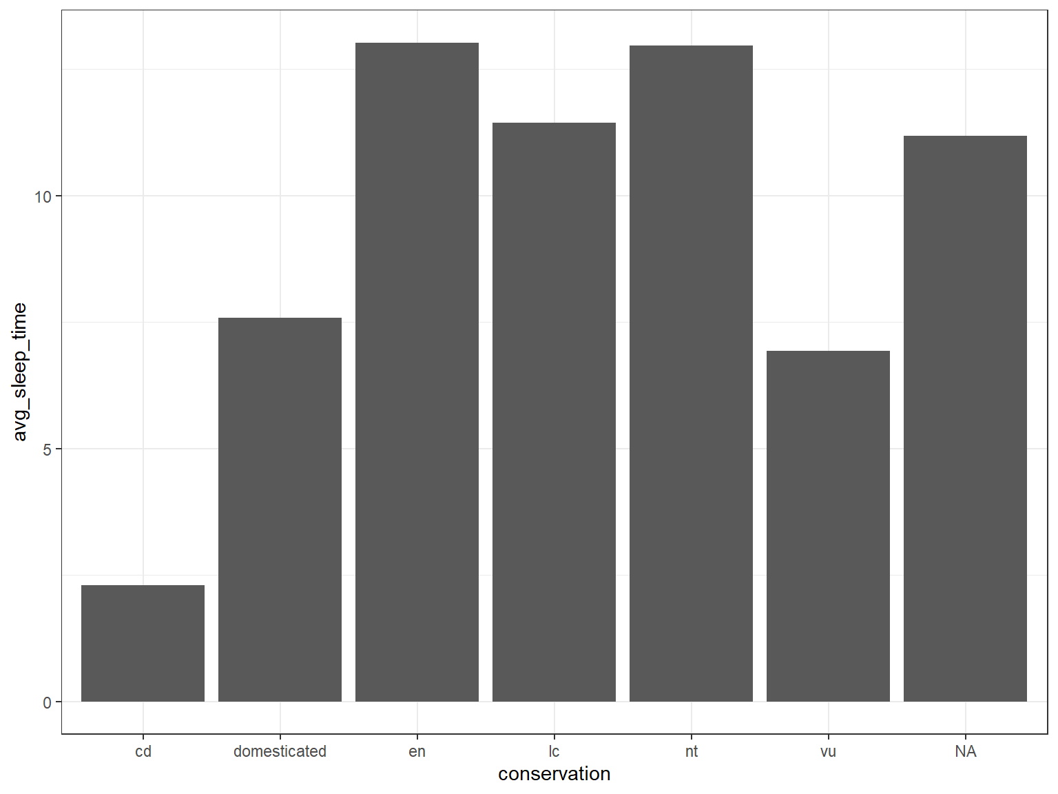 | sleep_total | conservation | name | genus | vore | order | sleep_rem | sleep_cycle | awake | brainwt | bodywt |