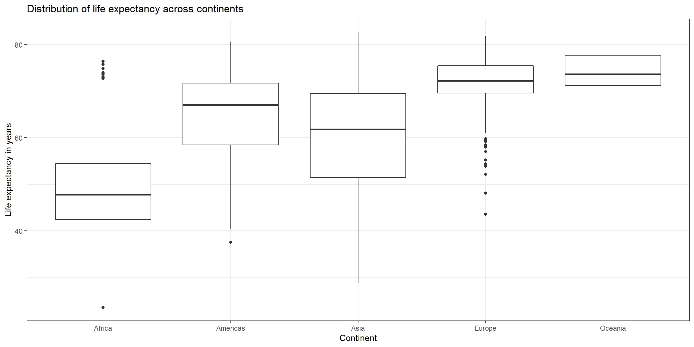 Use the data gapminder and create a boxplot using variables continent and lifeExp