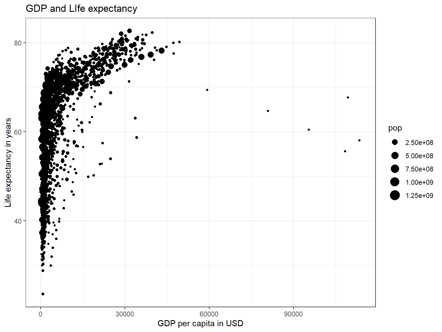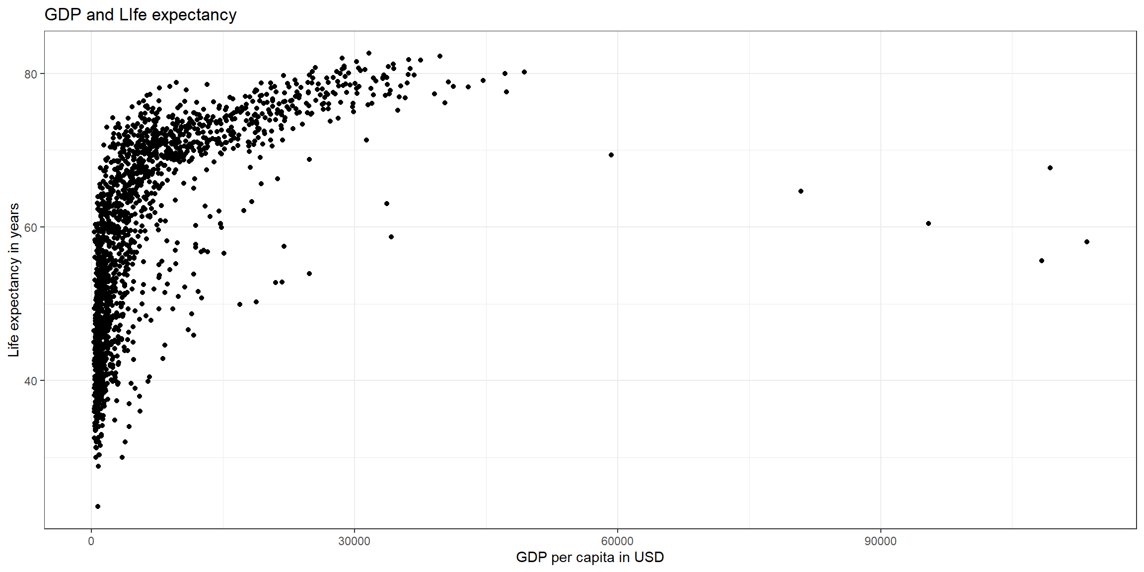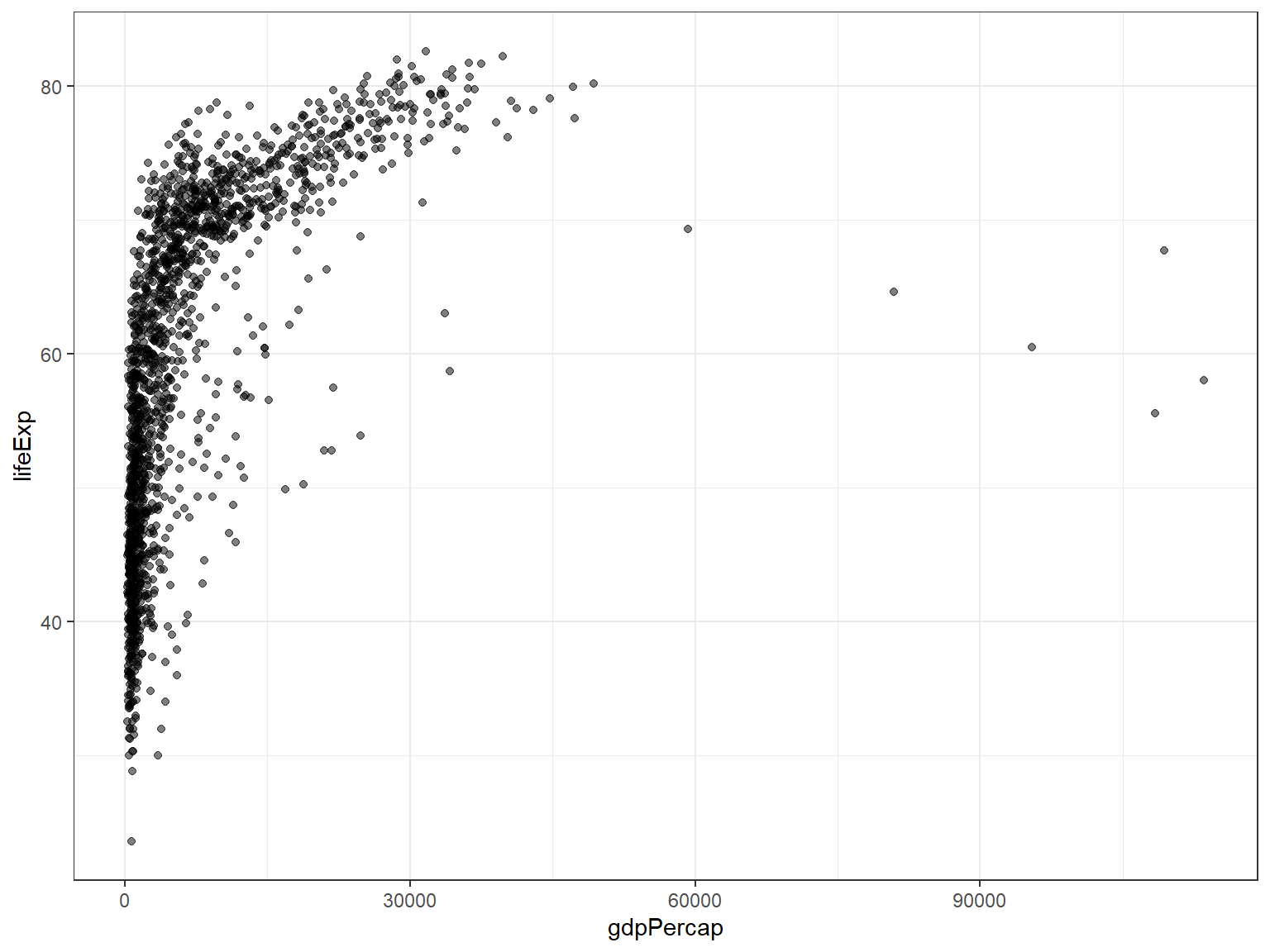 Use the data gapminder and create a point/scatter chart using variables gdpPercap and lifeExp